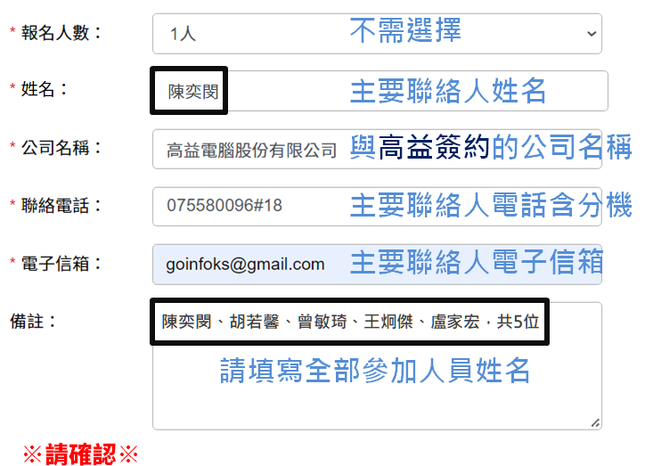 2025高益電腦使用者年會 日期:2025-10-28 時間:13:30 - 17:00 課程時數:3.5 報名課程 報名注意事項: 1.報名截止日期:114年10月17日(五) 或報名滿額時提前截止 2.年會會議名額有限,欲報從速,額滿即不受理報名。 3.若不克前來參與或欲索取年會手冊電子檔,可點選下方連結填寫資料,會後將以E-mail寄出。點我索取電子檔 回上一頁 報名課程 報名須知 報名資料填寫範例如下: 報名結果將回復至主要聯絡人電子信箱,請務必填寫正確,之後任何年會相關資訊有更新僅通知主要聯絡人 報名已額滿