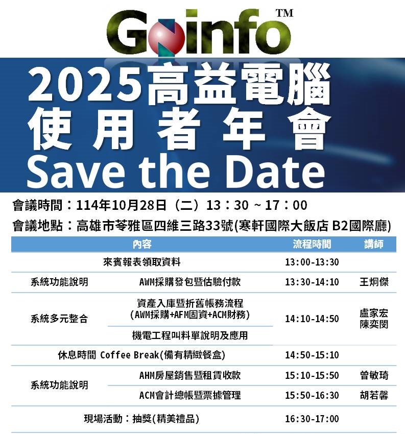 2025高益電腦使用者年會 日期:2025-10-28 時間:13:30 - 17:00 課程時數:3.5 報名課程 報名注意事項: 1.報名截止日期:114年10月17日(五) 或報名滿額時提前截止 2.年會會議名額有限,欲報從速,額滿即不受理報名。 3.若不克前來參與或欲索取年會手冊電子檔,可點選下方連結填寫資料,會後將以E-mail寄出。點我索取電子檔 回上一頁 報名課程 報名須知 報名資料填寫範例如下: 報名結果將回復至主要聯絡人電子信箱,請務必填寫正確,之後任何年會相關資訊有更新僅通知主要聯絡人 報名已額滿